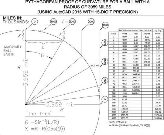 As you will see in the Long Distance Evidence playlist, there are many laser tests done by others across bodies of water that all show zero curvature, and over much greater distances. To convince viewers of curvature, PBS decided to tilt their laser upwards from perfectly level just enough so as to give a reading of exactly 6 feet at a 3 mile distance. Their commitment to this 6 feet at 3 miles measurement is actually useful for those of us debunking their results, as I'll explain below.Trigonometry and Pythagorean geometry dictate that given a spherical earth with a radius of 3,959 miles, the Earth would have had to curve downwards by exactly 6 feet at a distance of exactly 3 miles.Online calculators will do the curvature math for you, but if you would like to know how this curvature is calculated, click this button.